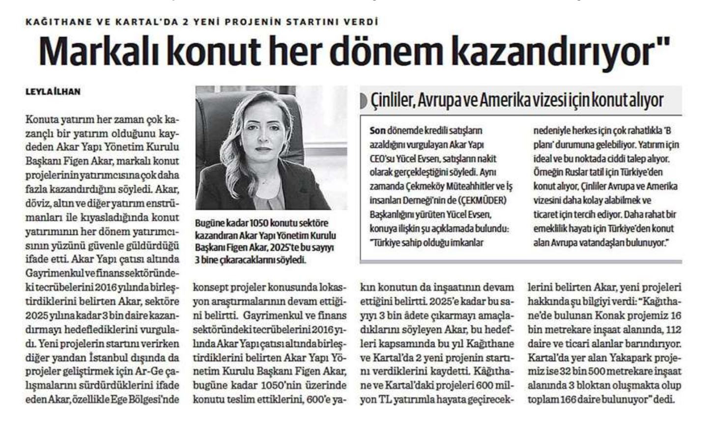 Akar Yapı Yönetim Kurulu Başkanı Figen Akar: “Konut sektörü Türkiye ekonomisinin lokomotifi. Sektörün canlanması ve konut satışlarının artması için kredi faiz oranlarının düşmesi çok önemli" dedi.