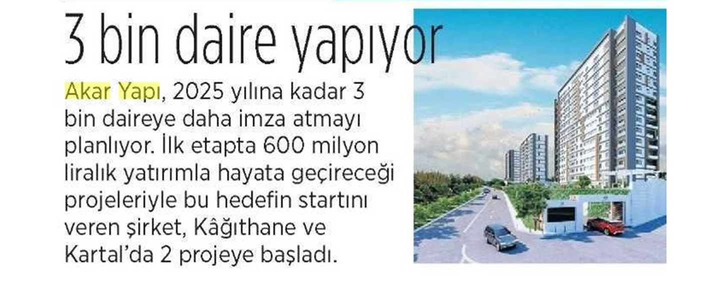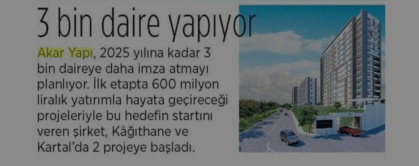Gayrimenkul sektörüne binlerce prestijli daire kazandıran Akar Yapı, 2025 yılına kadar 3 bin daireye daha imza atmayı planlıyor. İlk etapta 600 milyon TL’lik yatırımla hayata geçirecegi projeleriyle bu hedefin startını veren şirket, Kâgıthane ve Kartal’da 2 projeye başladı. Proje aşamasında ve sonrasında yatırımcısına her zaman kazandıran şirket Kâgıthane ve Kartal’da 2 projeye başladı.