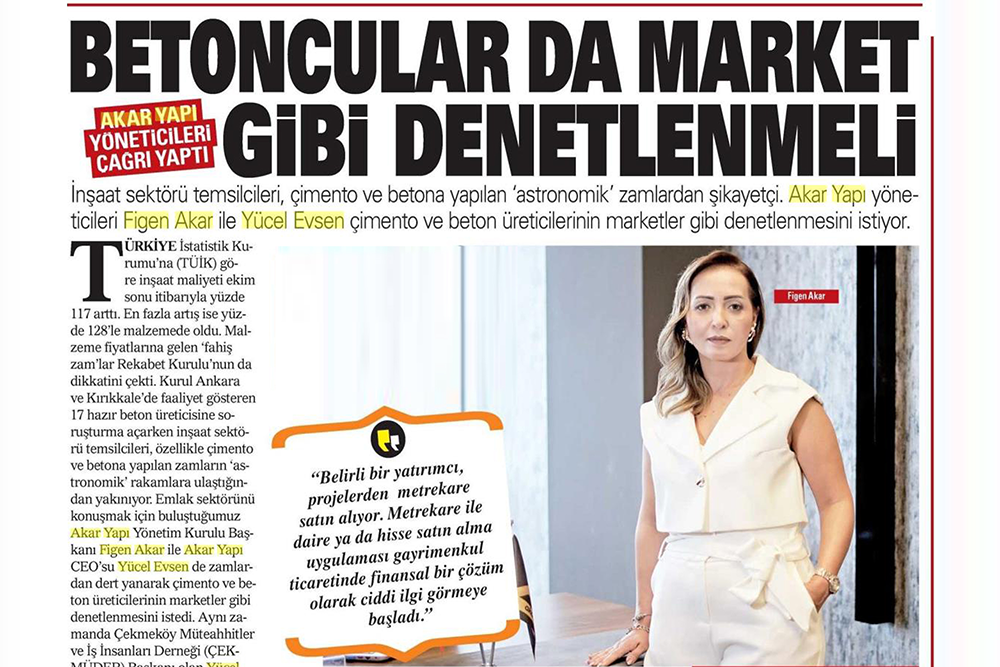 İnşaat sektörü temsilcileri, çimento ve betona yapılan ‘astronomik' zamlardan şikayetçi. Akar Yapı yöneticileri Figen Akar ile Yücel Evsen çimento ve beton üreticilerinin marketler gibi denetlenmesini istiyor.