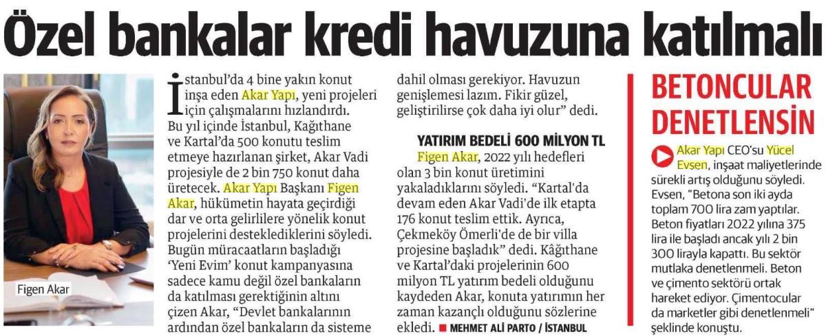 Akar Yapı Başkanı Figen Akar, hükümetin hayata geçirdiği dar ve orta gelirlilere yönelik konut projelerini desteklediklerini söyledi. Bugün müracaatların başladığı ‘Yeni Evim’ konut kampanyasına sadece kamu değil özel bankaların da katılması gerektiğinin altını çizen Akar, “Devlet bankalarının ardından özel bankaların da sisteme dahil olması gerekiyor. Havuzun genişlemesi lazım. Fikir güzel, geliştirilirse çok daha iyi olur” dedi.
