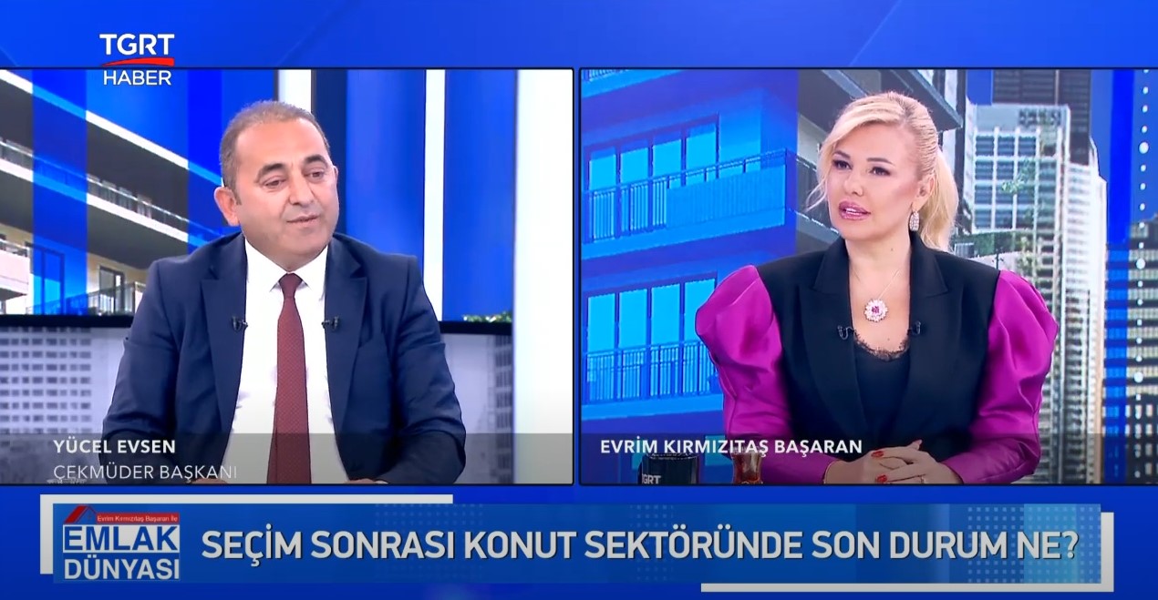 Evrim Kırmızıtaş Başaran'ın sunuculuğunu yaptığı Emlak Dünyası programına, CEO'muz Yücel Evsen Konuk oldu. TGRT Haber ekranlarında seçim sonrası emlak sektörünün durumu ile ilgili bilgiler verdi.